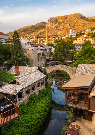 Beautiful view of the medieval town of Mostar from the Old Bridge in Bosnia and Herzegovina