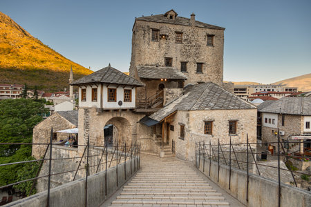 View of the historic Old Bridge in Mostar at sunset. Bosnia and Herzegovina