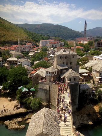Rebuilt iconic ancient bridge in downtown Mostar, Bosnia Herzegovina