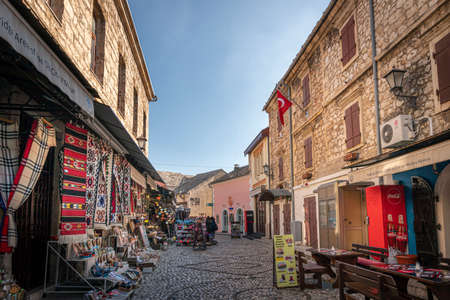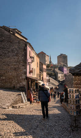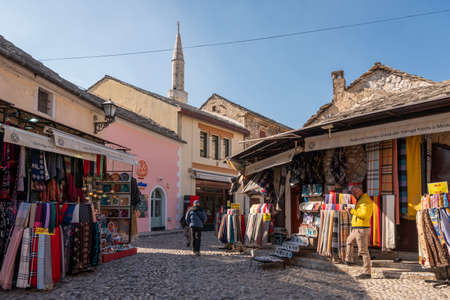Mostar, Bosnia and Herzegovina - September 15, 2018: cobbled street in the center of the Old Town. You can see the architecture typical of the region, numerous shops with souvenirs and regional handicraft products. Tourists are walking along the street. I