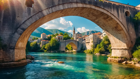 The iconic Stari Most bridge in Mostar, Bosnia, stretches over the Neretva River amidst historic architecture and vibrant greenery on a sunny day.