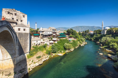 Neretva river near The Old Bridge in Mostar town, Bosnia and Herzegovina, Europe. Scenic view of an old town with a bridge over a river, showcasing historical architecture, serene waters and greenery.