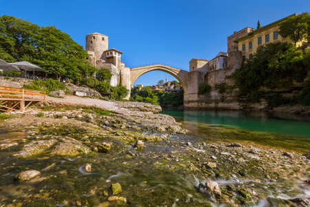 A beautiful view of the old bridge across the Neretva River in Mostar, Bosnia and Herzegovina, on a sunny summer day