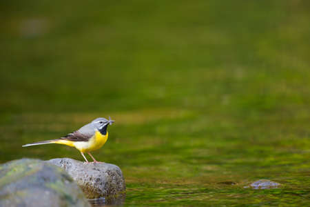 The grey wagtail standing on the stone at river with insects in beak