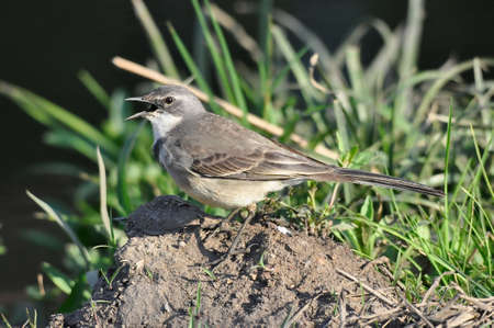 White gray little bird was a Wagtail on the grass horizontally