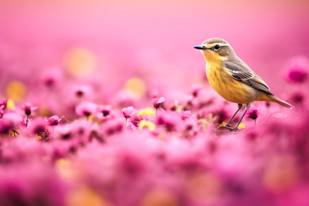bird amidst vibrant pink flowers, illustrating serene wildlife-flora harmony and nature's captivating beauty. Peaceful and picturesque