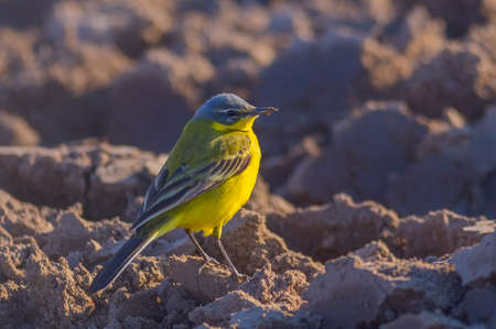 Yellow Wagtail bird, Motacilla flava in the field of rough ground