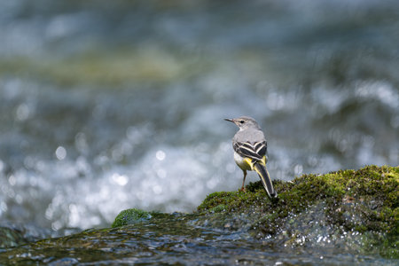 Yellow wagtail on a rock in a stream with blurred background