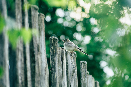 Wagtail sitting on an old fence. A beautiful bird on a blurred background in the second half of the day.