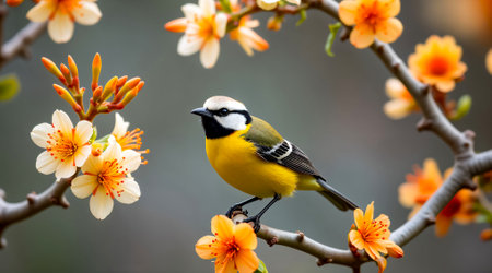 A vibrant yellow bird with distinctive markings is perched on a branch adorned with delicate orange blossoms. The serene garden environment captures the essence of spring.