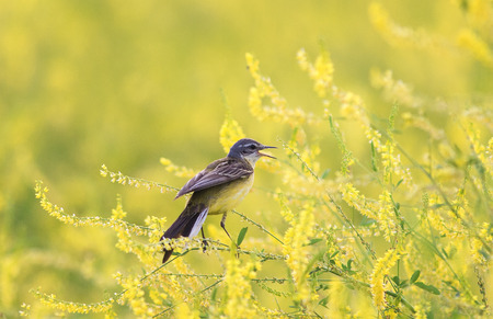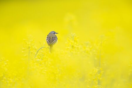 Yellow wagtail sits on the yellow rape on blurred yellow background
