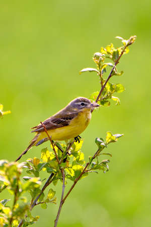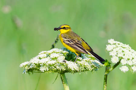 Western Yellow Wagtail bird with insect in his beak (Motacilla flava)