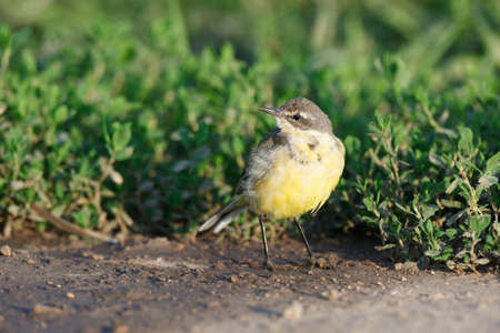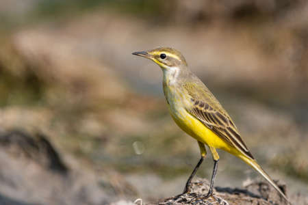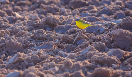 Yellow Wagtail bird, Motacilla flava in the field of rough ground