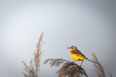A western yellow wagtail (Motacilla flava) perches among the reeds.