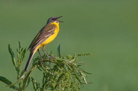 Western yellow wagtail singing from the plant