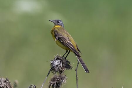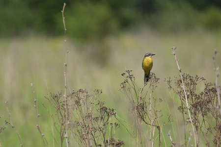 Yellow Wagtail, Western Yellow Wagtail, Blue-headed Wagtail, Motacilla flava. Yellow wagtail sits on a dry bush of a plant in the middle of green meadow against the backdrop of the evening sky. copy space
