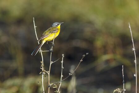 Western yellow wagtail, Motacilla flava. The bird sits on the stem of a dry plant