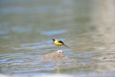 Yellow wagtail in the river with insects in the beak