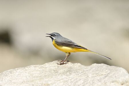 Portrait of grey wagtail standing on the river stone