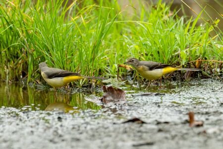 Grey wagtails wading on wet ground to find food after raining