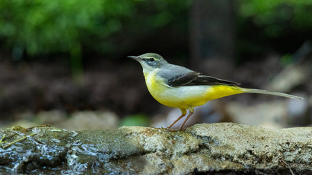 Grey Wagtail perching on the rock near small waterhole