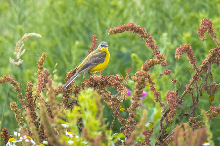 A male yellow Wagtail, Motacilla flava, sits on a branch with bird's nest material in its beak. Blured green grass meadow background, sunny day