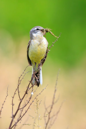 Closeup of a hunting western yellow wagtail bird Motacilla flava with prey in beak.