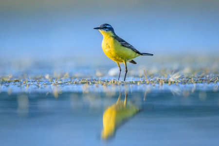 Closeup of a male western yellow wagtail bird Motacilla flava foraging in water on a sunny day during spring season.