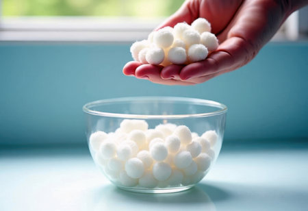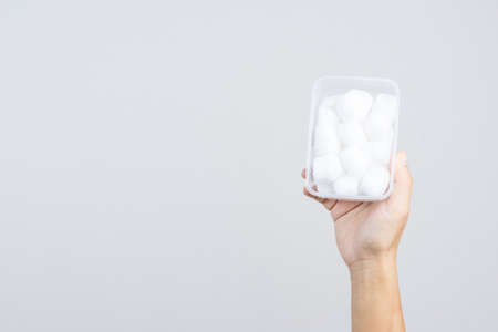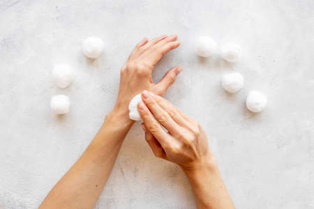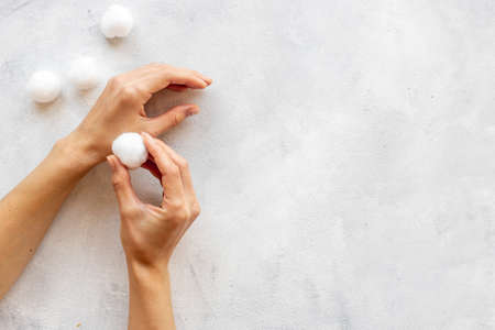 Female hands holding cotton wool balls for cleansing skin and boby care