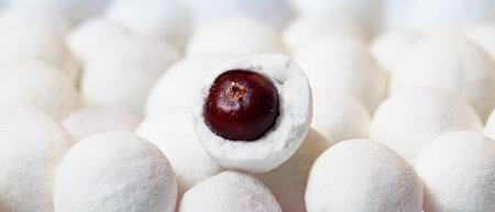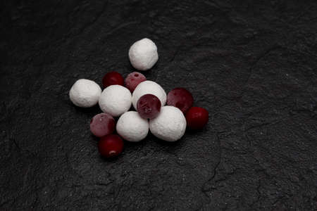 Cranberries in powdered sugar on dark stone textured background. Small round white berry candies. Delicious and healthy dessert. selective focus.