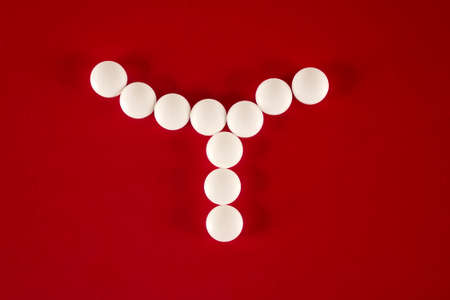 Bacterial cell made of white tablets with copy space for text on a red background, top view