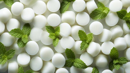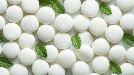 Pile of white mints candy with a green mint leaves. Generative AI.