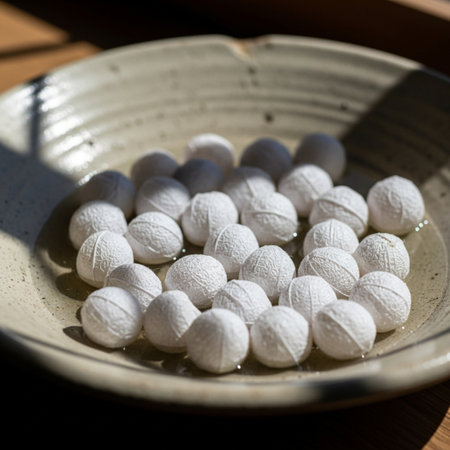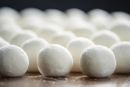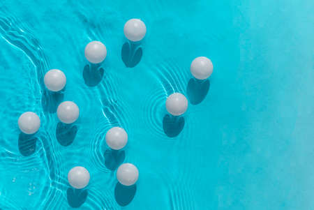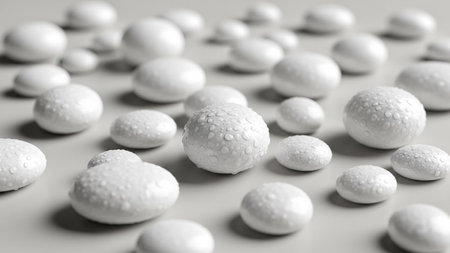 Numerous white spheres with water droplets are scattered across a light gray surface, creating a textured pattern.