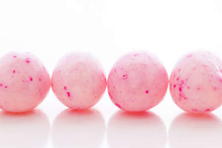 Pink, violet, purple, red, green, yellow, orange round candies with white marshmallows on a white background. Selective focus