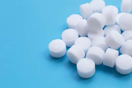 Pills close-up.Round, solid pharmaceutical oral dosage form of medication.