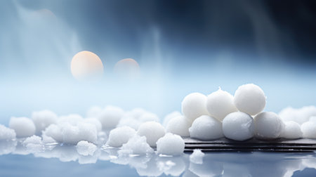 This abstract image presents a series of spheres seemingly falling onto a soft, textured base. The composition features a gradient background, enhancing the visual depth of the scene. The color palette is predominantly white and gray, suggesting a clean, minimalist aesthetic. Suitable for conceptual illustrations, design elements, and various commercial applications.
