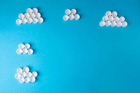 Snowballs on pastel blue background. New Year and Christmas idea. Minimal abstract winter holidays concept. Copy space.