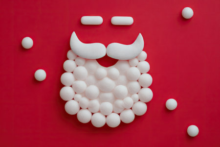 An overhead composition presents an abstract Santa Claus face constructed from white circular and rectangular forms against a vivid red backdrop. The design highlights a circular beard, mustache, and eyes. This vibrant artwork is suitable for various commercial purposes, including festive promotions and graphic design projects.