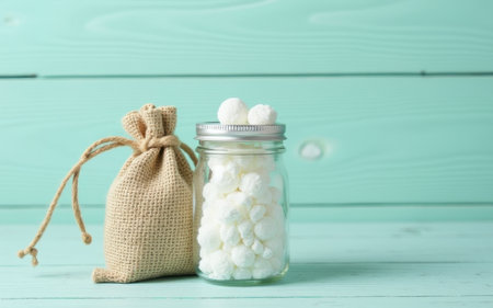 On a turquoise background there is a canvas bag and a glass jar of bath salts