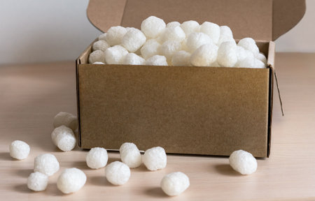 cardboard box filled with biodegradable packing peanuts from corn starch, eco-friendly filler modern shipping practices focused on reducing plastic waste , protecting fragile items during transport
