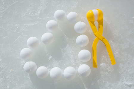 A lot of snowballs laid out on the ice in the form of a heart. A tool for modeling snowballs. Frozen ice in the scratches. Winter fun, playing with snow, children's games