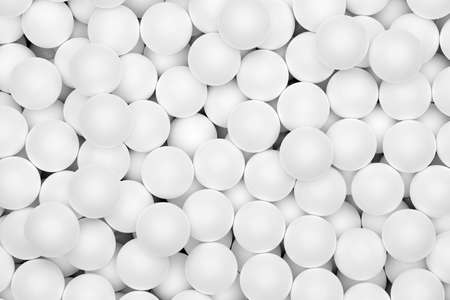 Ball pool or pit filled with white plastic balls, abstract texture background top view flat lay from above, 3D illustration