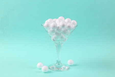 White balls in cocktail glass on blue background. creative ideas. Minimal party concept layout