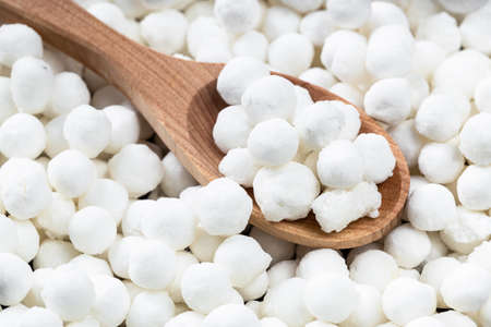 above view of wooden spoon with raw tapioca pearls close up on pile of sugar