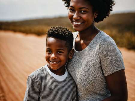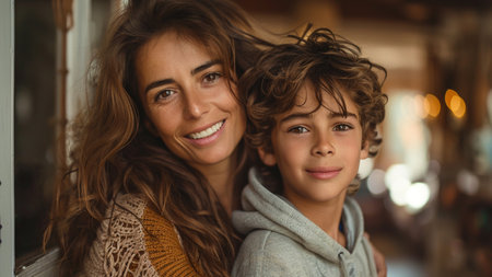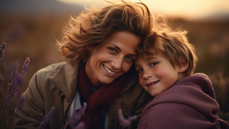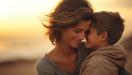 Mother embracing her son with a warm smile against a sunset background. Concept of love, family, and connection.