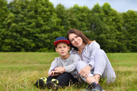 The boy hugs mom. Woman rests with her son in nature. The child kisses mom. Portrait of a mother and baby.