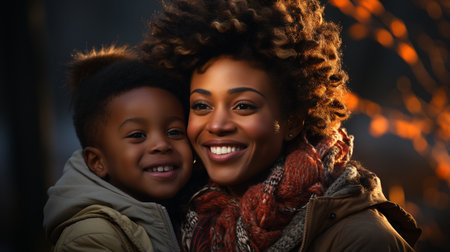 Portrait of an African american mother with his son standing outdoors in the park, having fun. Monoparental family.