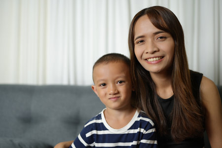 Asian Mother and Son is kissing and hugging for Love and affection and Family togetherness concept