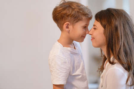 Close up portrait of smiling young mother and her preschool son touching noses.