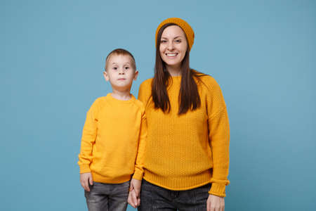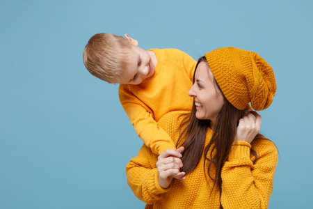 Woman in yellow clothes have fun posing with cute child baby boy 4-5 years old. Mommy little kid son isolated on blue background studio portrait. Mothers Day love family parenthood childhood concept.